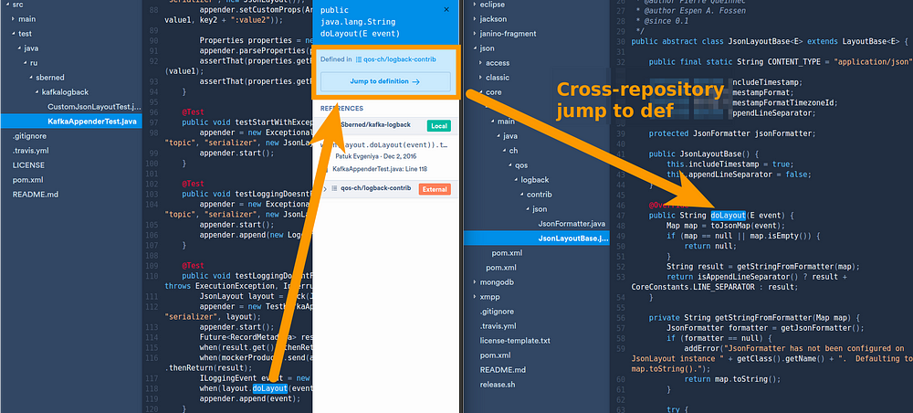 Sourcegraph's jump-to-definition works even if the definition is in a separate repository or an open source library. Because it's all on the web, there's no need to check out code to your local machine.
