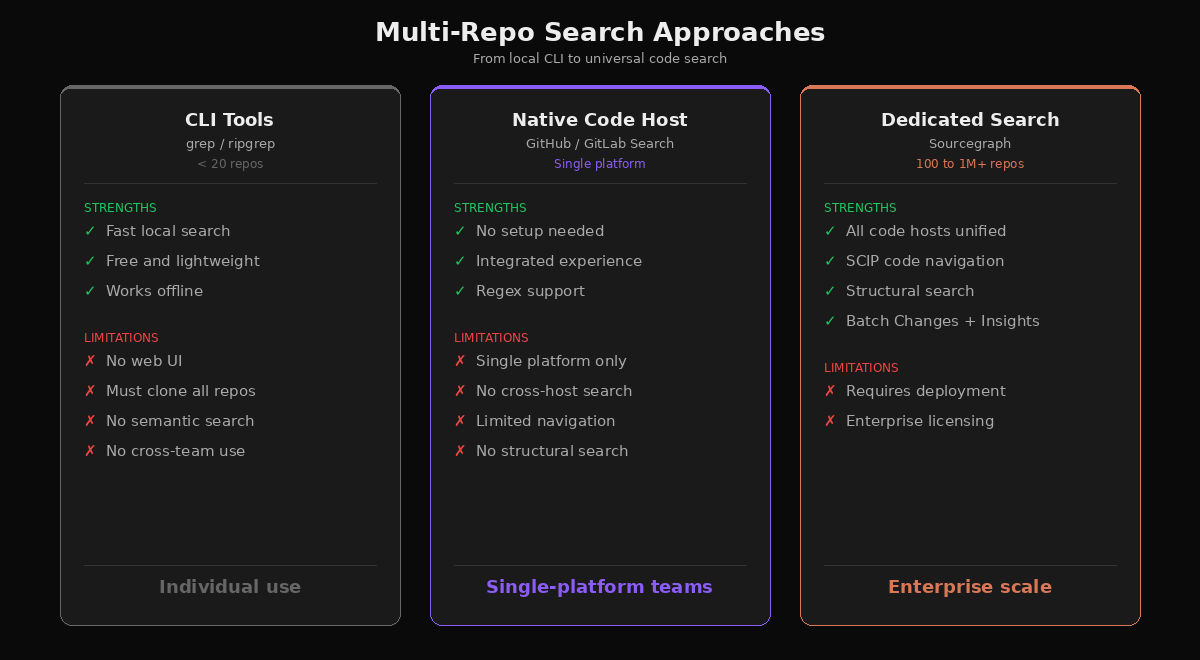 Not all multi-repo search approaches are equal. The right choice depends on your organization's size, code host configuration, and what you need beyond basic text matching.